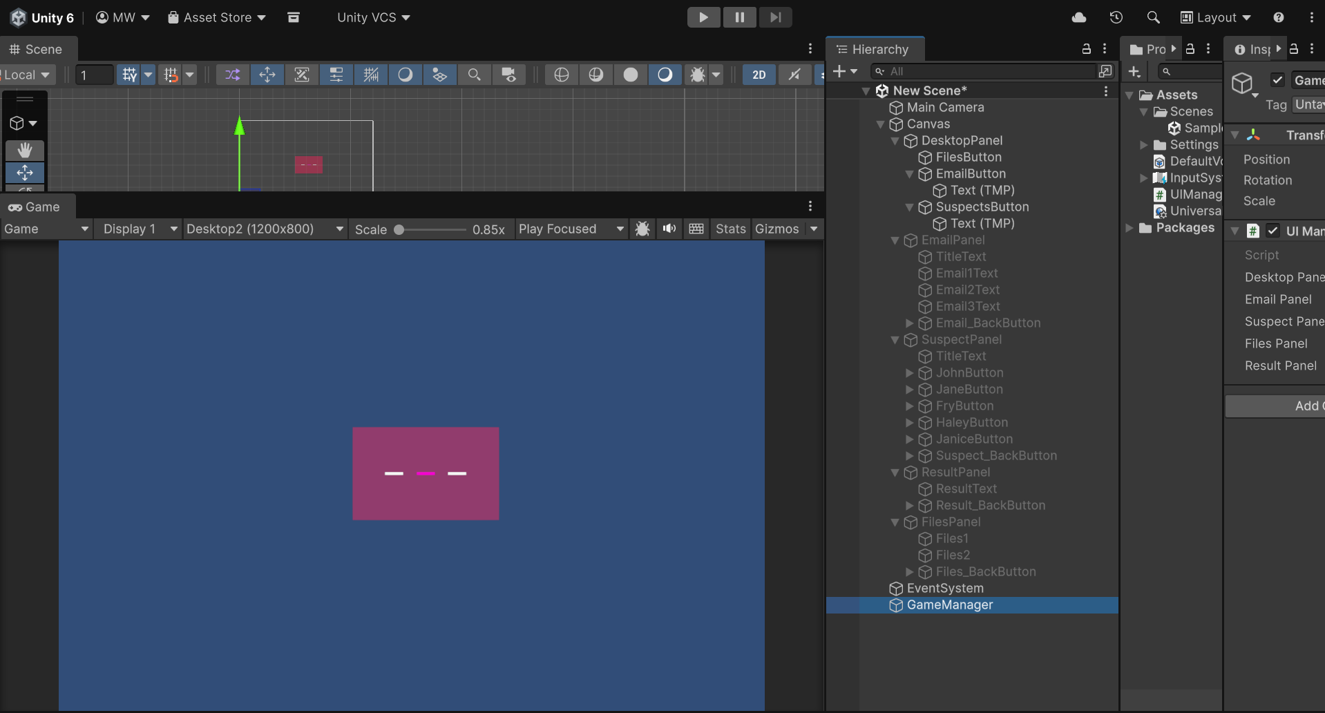 Got the basics, email, desktop, suspects and results panel. upon clicking play only the desktop is visible. when clicking a button for example email only the email is visible, back button takes you back to the desktop. currently no button for results because its not needed.